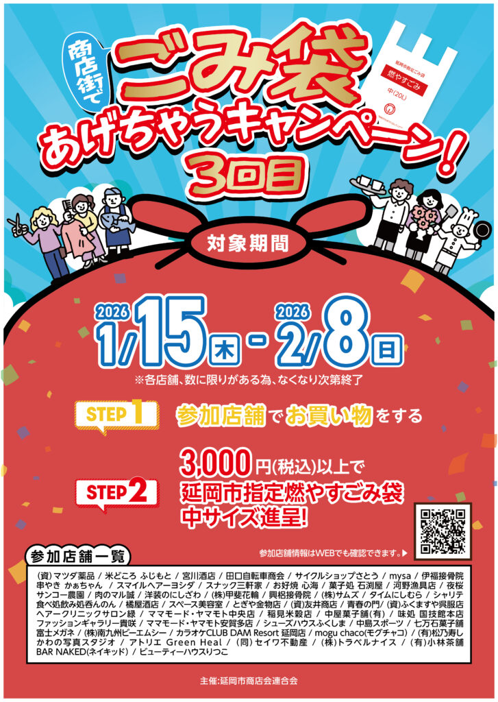 参加店舗で3,000円以上(税込)のお買い物をすると、延岡市指定燃やすごみ袋中サイズを進呈します。※数に限りがありますので、ご注意ください。
